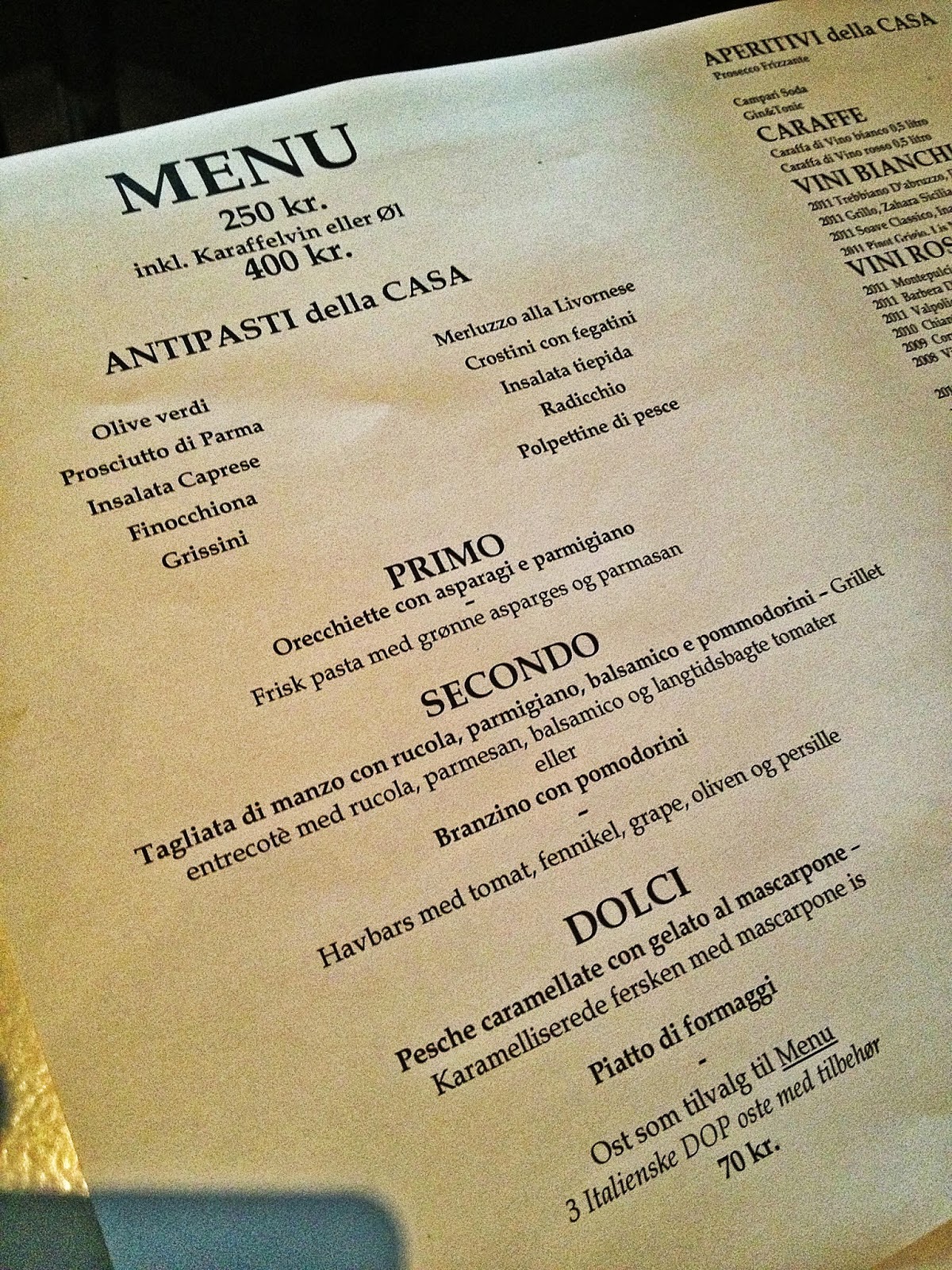 Are you with your friends and want to have a delicious but at the same time fun dinner with loads of wine? Grab your friends and have a blast in Vespa! They have a special offer where you can have a full menu (antipasti, primo, secondo and desert) with all the wine you can drink (no limits) for around 400 DKK per person (when we visited the place the prices were at 400 DKK. We checked their website apparently now it is 425 DKK. Check their current menu here: http://cofoco.dk/vespa_menu.php).